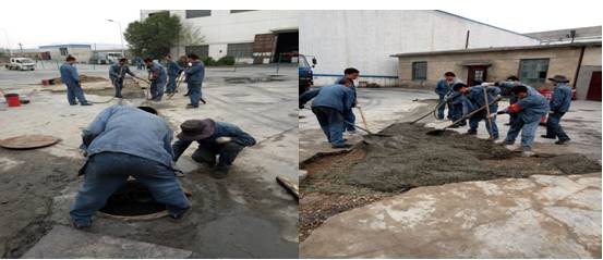 时至夏日,天气多变。临时土建维修队充分发挥车间人员中懂得土建施工技能的优势,悉心谋划,从职工家中借用搅拌机等施工机械,加班加点有序进行着屋面防水修复、路面地基处理、排水沟的修复等维修工作。在公司车队密切配合下,截至6月4日共修复屋面防水358平方米,路面维修290平方米、路基整修87立方米,排水沟修复15米,生产厂区道路破裂,沥青浇灌等各项工作。