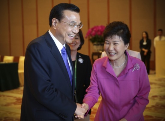 韩国总统朴槿惠对李克强总理表示:"韩中日三国合作有利于地区和平稳定。要引导日本抱着正确的历史观,为东北亚和平做出贡献。"