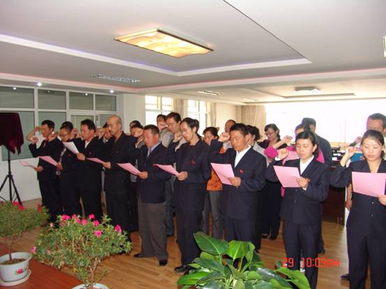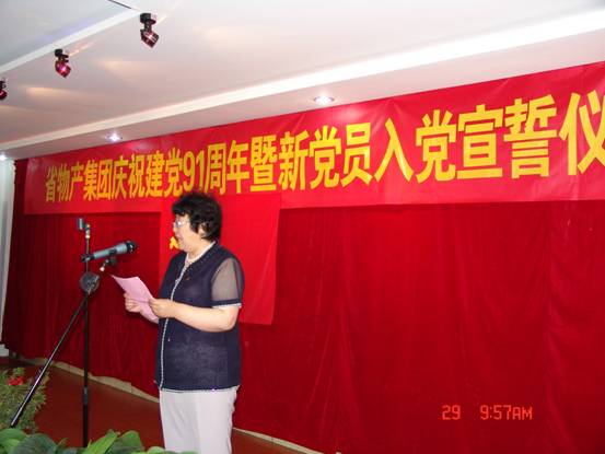 我宣誓:"我志愿加入中国共产党,拥护党的纲领,遵守党的章程,履行党员义务,执行党的决定,严守党的纪律,保守党的秘密,对党忠诚,积极工作,为共产主义奋斗终身,随时准备为党和人民牺牲一切,永不叛党"。6月29日上午10∶00时,17名新加入党组织的中国共产党预备党员、所属各党组织书记、老党员代表等30余人的庄严宣誓,标志着青海物产系统庆祝建党91周年系列活动正式展开。