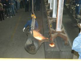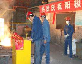 2012年7月7日上午11点零19分,青海物产工业投资有限公司10万吨电解铝/年升级改造项目,简易阳极组装车间大门前鞭炮齐鸣。青海物产工业投资有限公司党总支副书记、青海长春炭素有限公司总经理王松华,公司常务副总经理、项目副总指挥常海宁,工业投资和长春炭素公司副总经理姜红萍,公司副总经理张秉瑜,总经理助理范登福等公司领导和各车间、部室的职工出席了简单的点火浇铸仪式。王松华同志按下了点火按钮郑重宣布浇铸正式开始。当中频炉工将第一炉铁水倒入抬包时,标志着新阳极组装车间正式投产运行。