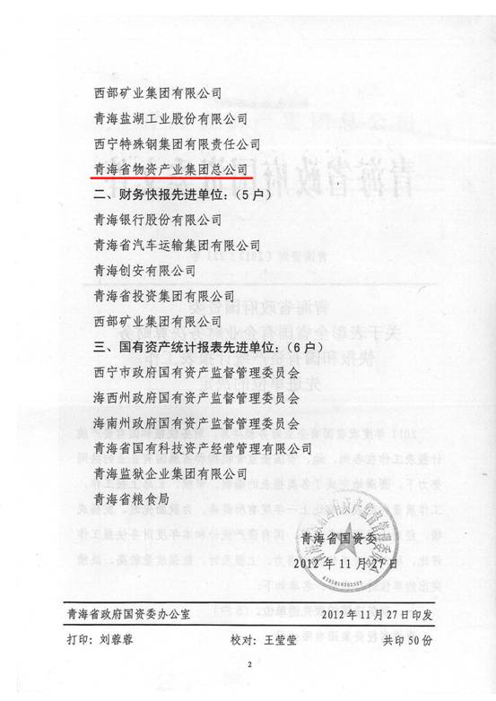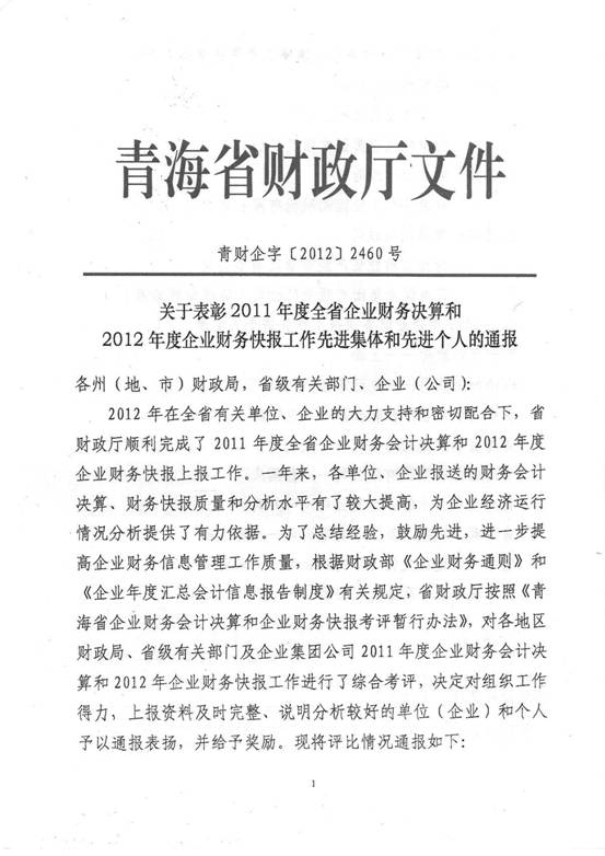 2012年,在集团及所属各公司领导的高度重视下,在所属各公司的大力支持和密切配合下,在辛勤工作在财务会计岗位上的同事们的共同努力下,集团总公司圆满完成了省国资委和省财政厅各类报表的上报工作,财务信息工作质量、时效性和财务分析水平都比上一年度有所提高,受到了省国资委和省财政厅的好评,集团总公司2011年度财务决算工作被省国资委评为先进单位,集团财务审计部张莉青同志被省财政厅评为2012年度财务快报工作先进个人。